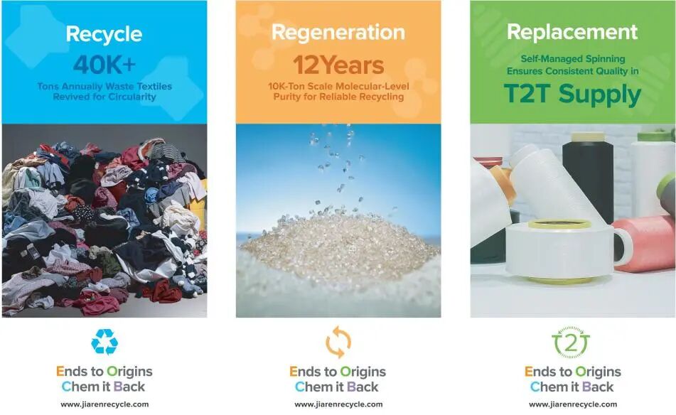 佳人專注于三大核心領域:搭建紡織品回收體系、研發循環再生技術、拓展再生材料高價值應用場景 —— 我們提供的不止是再生材料本身,更是推動行業循環的整體解決方案。佳人的愿景是構建閉環循環系統,通過透明、負責任的生產體系,將紡織廢料轉化為高價值應用產品,推動聚酯行業實現真正的循環發展。